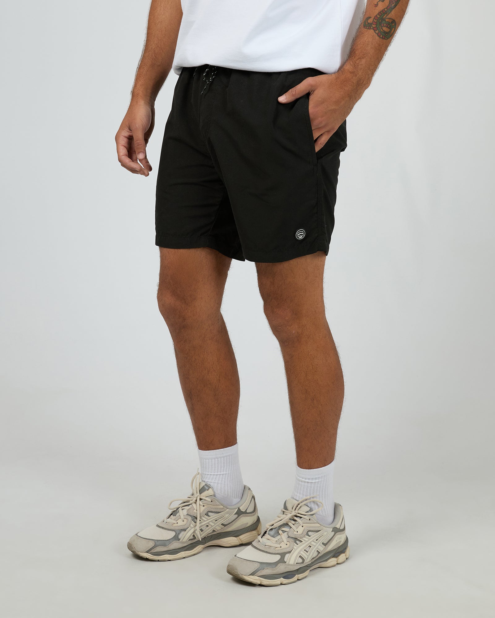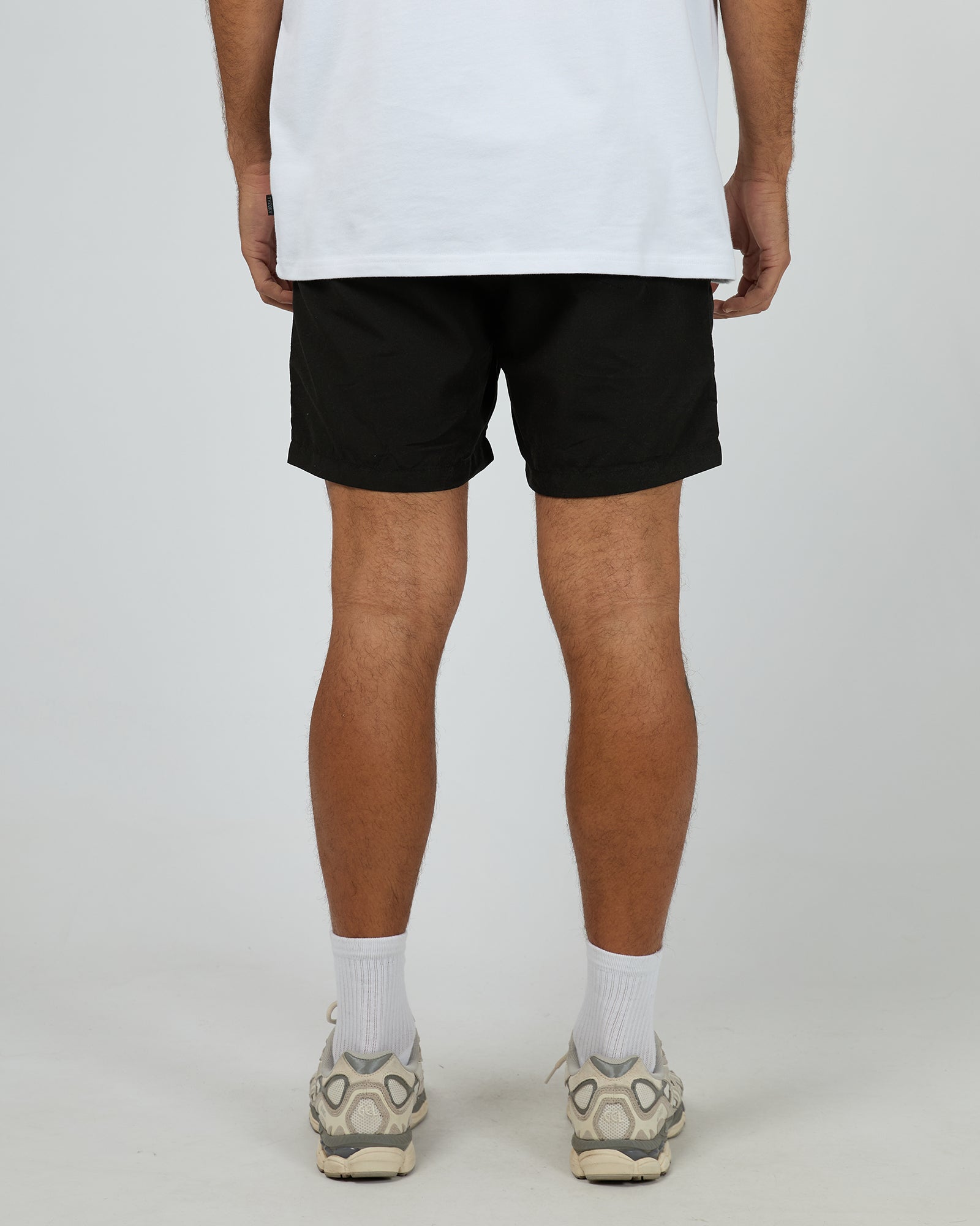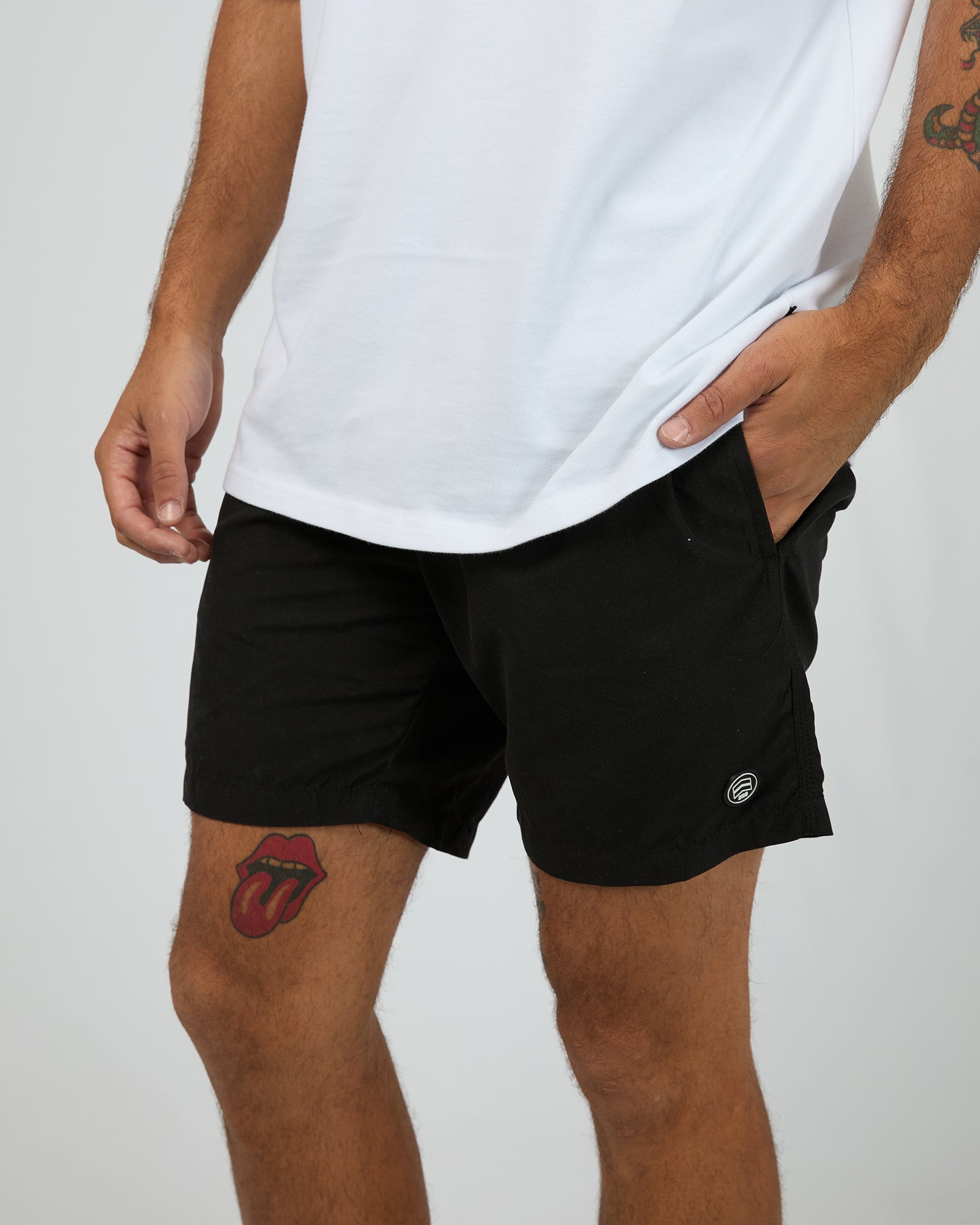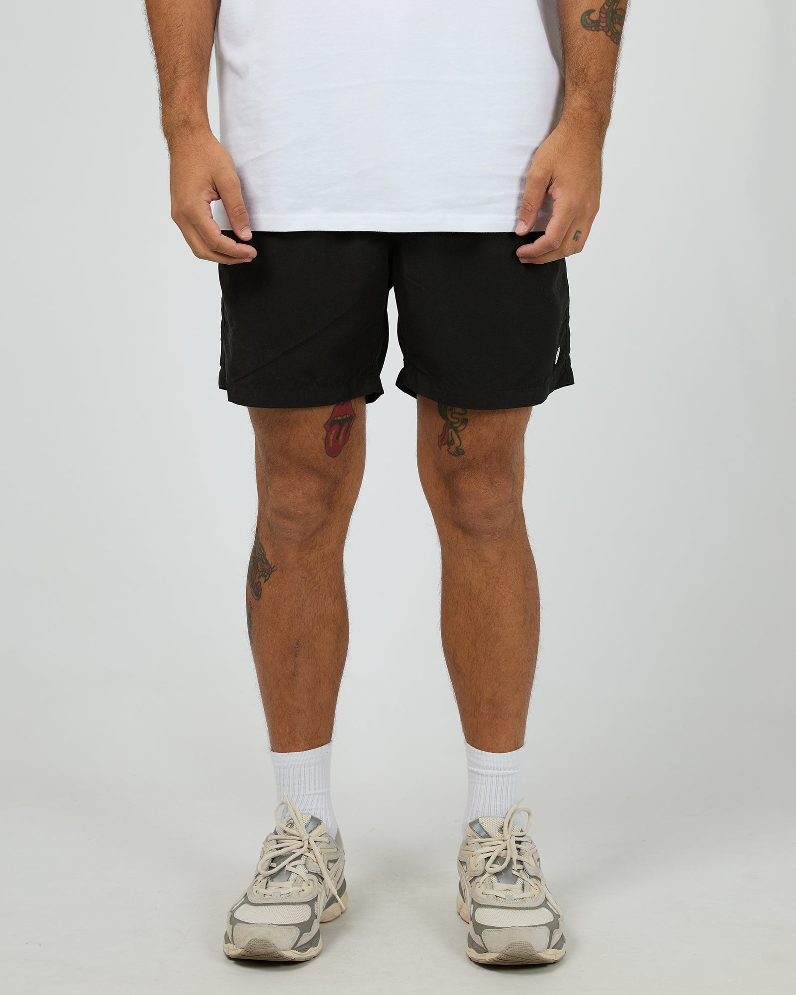 The short features an elastic waistband with draw cord, mesh lined pockets and small branding on left leg.
