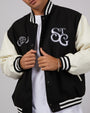 Stay warm and stylish with our Varsity Jacket. Its collegiate style and contrasting sleeves add a touch of athletic charm to any outfit. Made with high-quality materials, this jacket is a must-have for any fashion-forward individual. Elevate your wardrobe with this timeless piece.